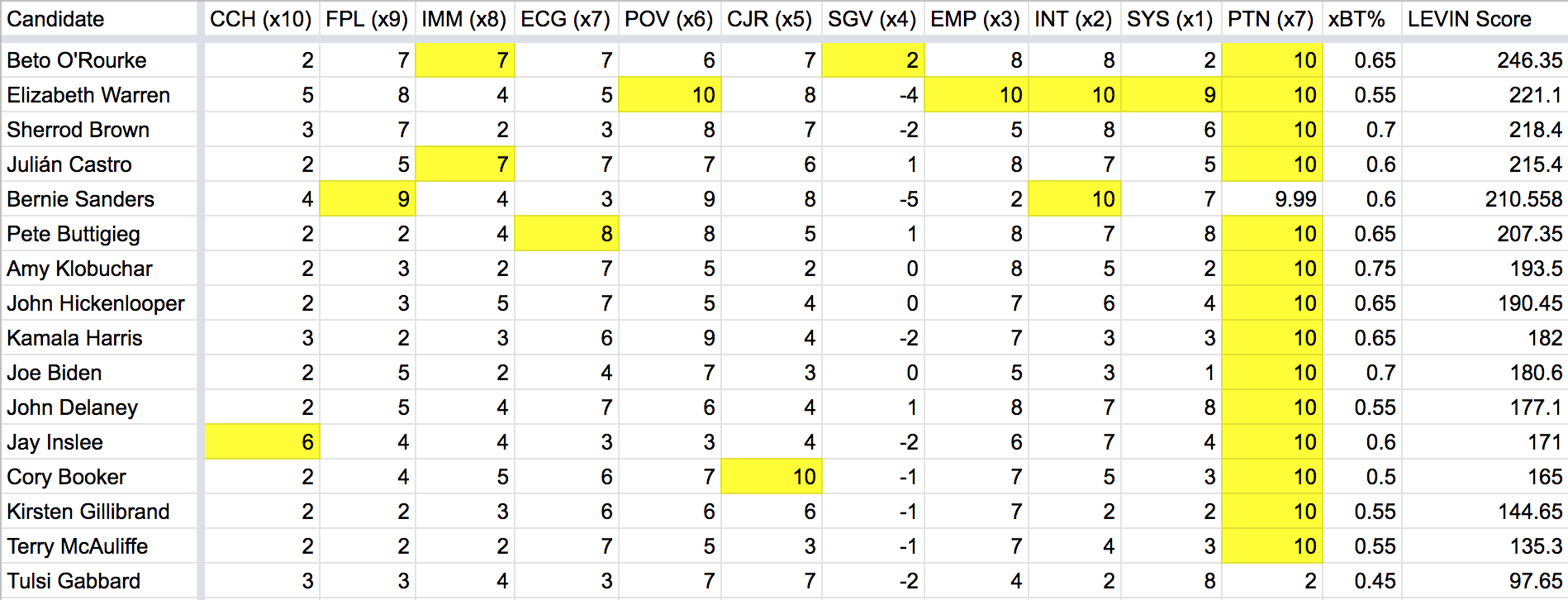 I’m combining the attributes I’m looking for in a 2020 candidate into the immodestly named LEVIN score. I’ll figure out what the letters mean later. But here are what the letters in the spreadsheet mean.